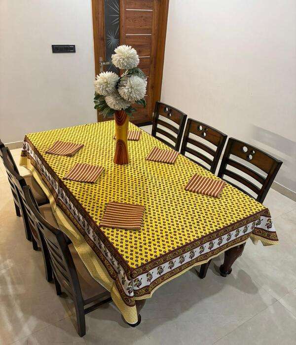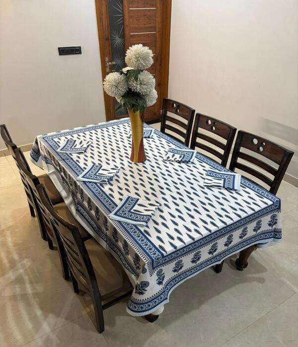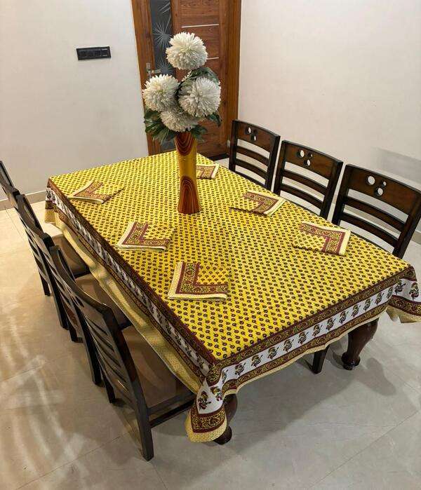 Juego de Cubierta de Mesa de Comedor de Algodón con Estampado a Mano de Calidad de Exportación con 6 Servilletas, Mantelería Suave, Duradera y Lavable para Hotel