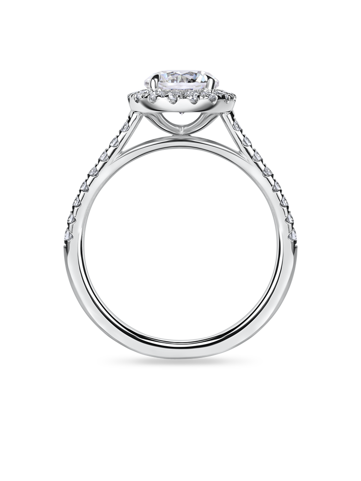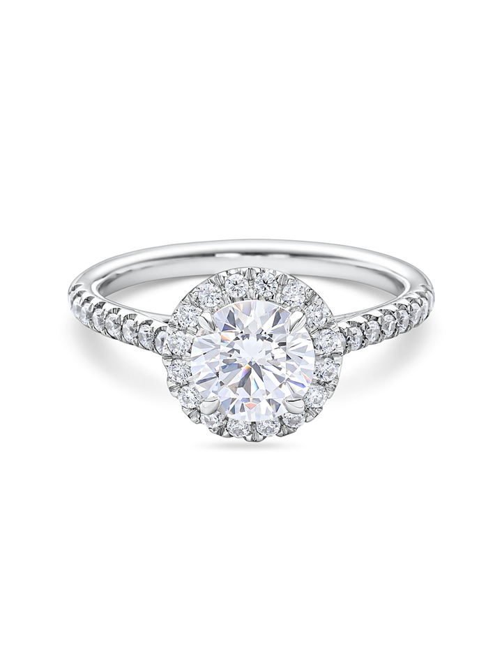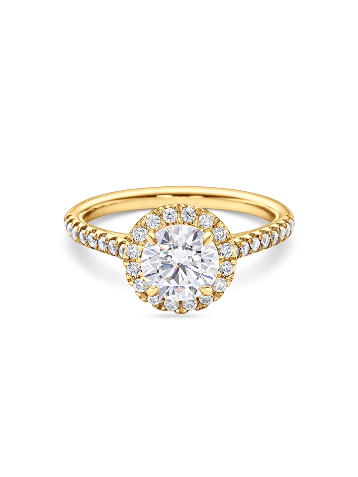 Exquisito Anillo de Compromiso con Halo Pavé y Corte Redondo de 1+ Ct, Cultivado en Laboratorio, en Oro Amarillo, Blanco, Rosa y Platino de 18K