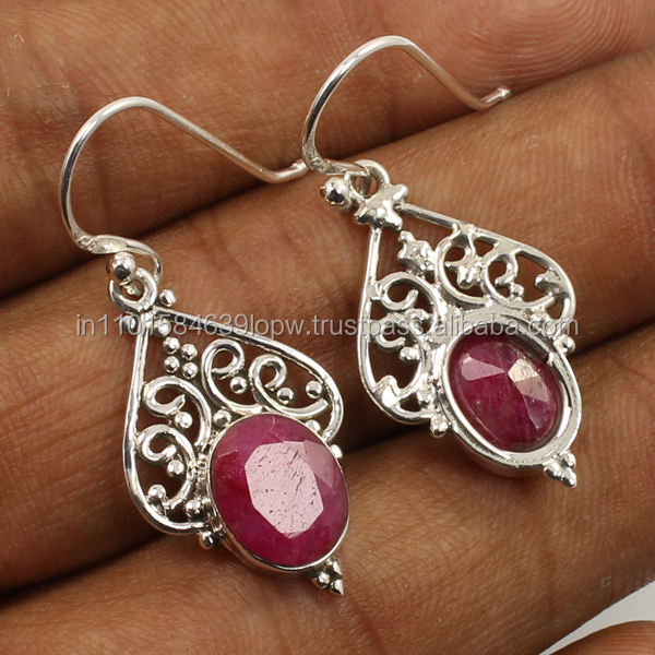 Exquisitos Pendientes Colgantes Tribales de Plata de Ley 925 con Rubíes Teñidos, Corte Ovalado, Accesorios de Joyería Impresionantes