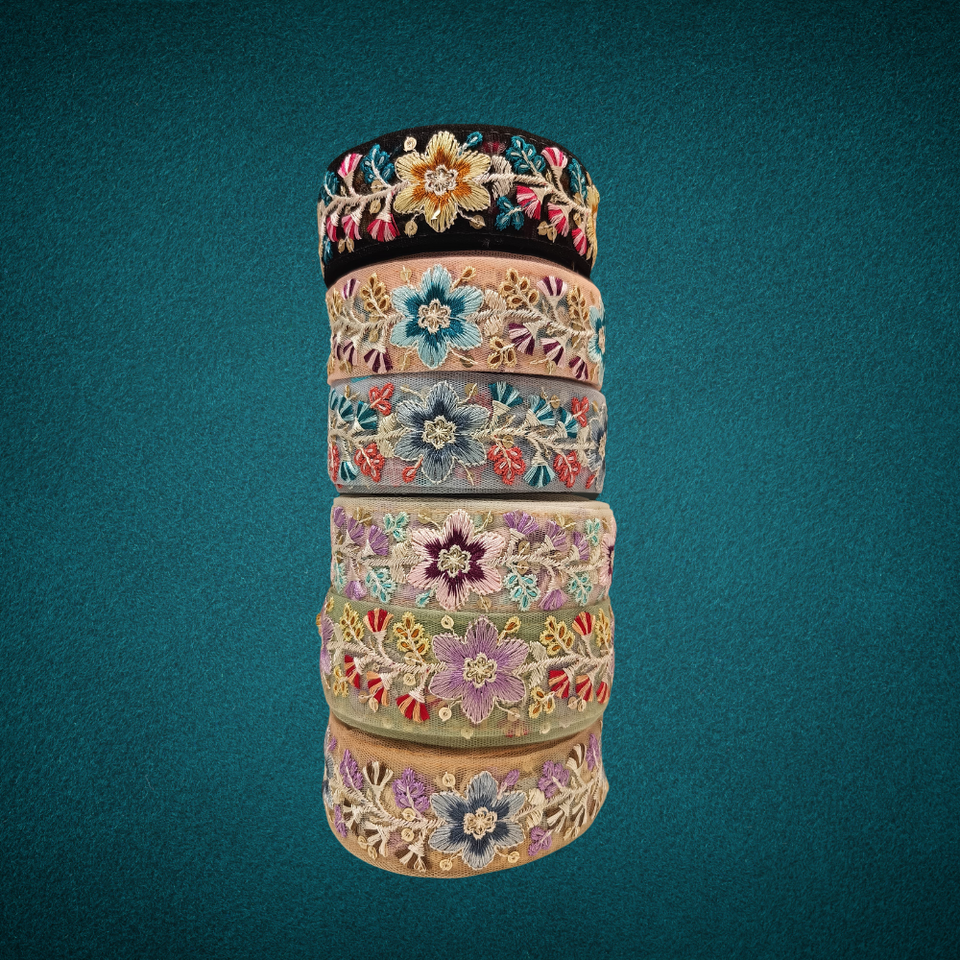 Exquisita tela de encaje bordado floral colorido con detalles intrincados para proyectos de moda elegante y decoración del hogar