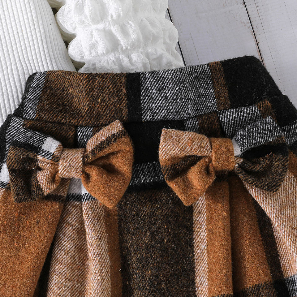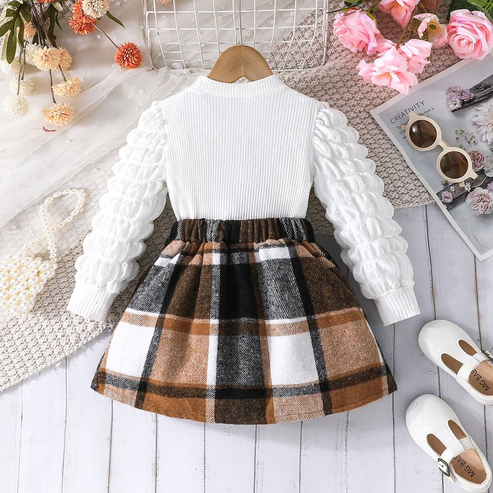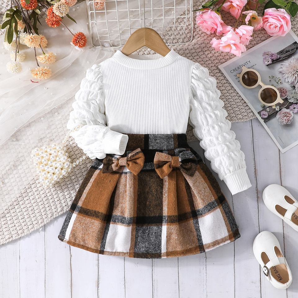 Exquisito y Elegante Conjunto de Dos Piezas para Niñas de 3 a 8 Años, Blusa de Moda con Mangas Abullonadas y Falda Plisada con Estampado a Cuadros, Lazos Dulces