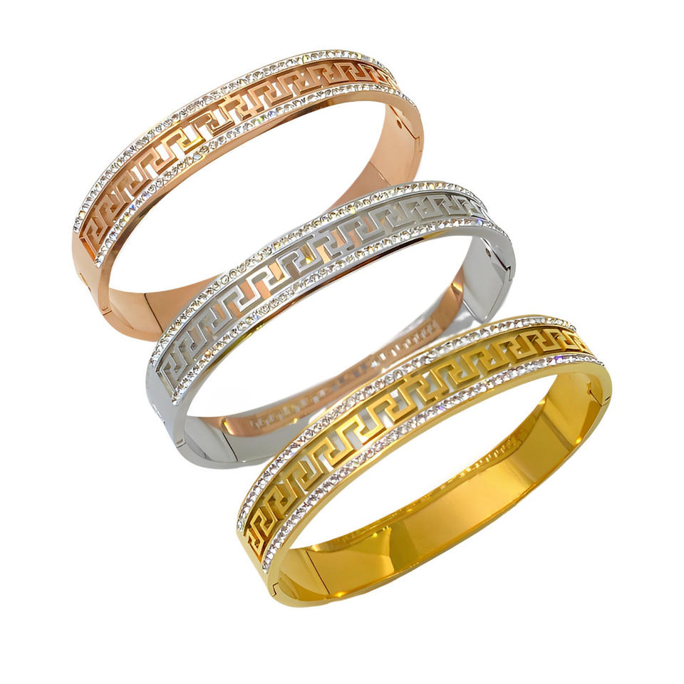 Exquisito Brazalete de Acero Inoxidable Chapado en Oro, Joyería de Moda, Diseño Largo con Textura de Rejilla, Hueco, con Incrustaciones de Circonita, Elegante y con Estilo