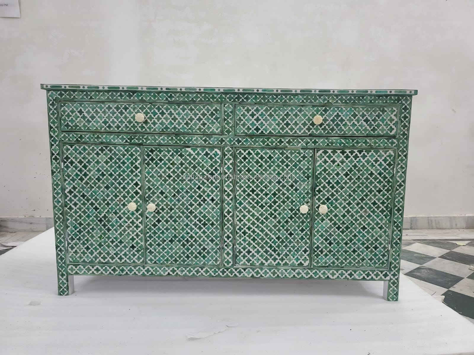 Exquisito Cómoda Marroquí con Incrustaciones de Madreperla Verde, Elegancia Artesanal/Decoración Religiosa Hecha a Mano para el Hogar