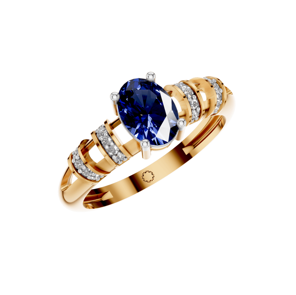 Estilo:Anillo de banda dividida con zafiro ovalado y detalles de diamantes