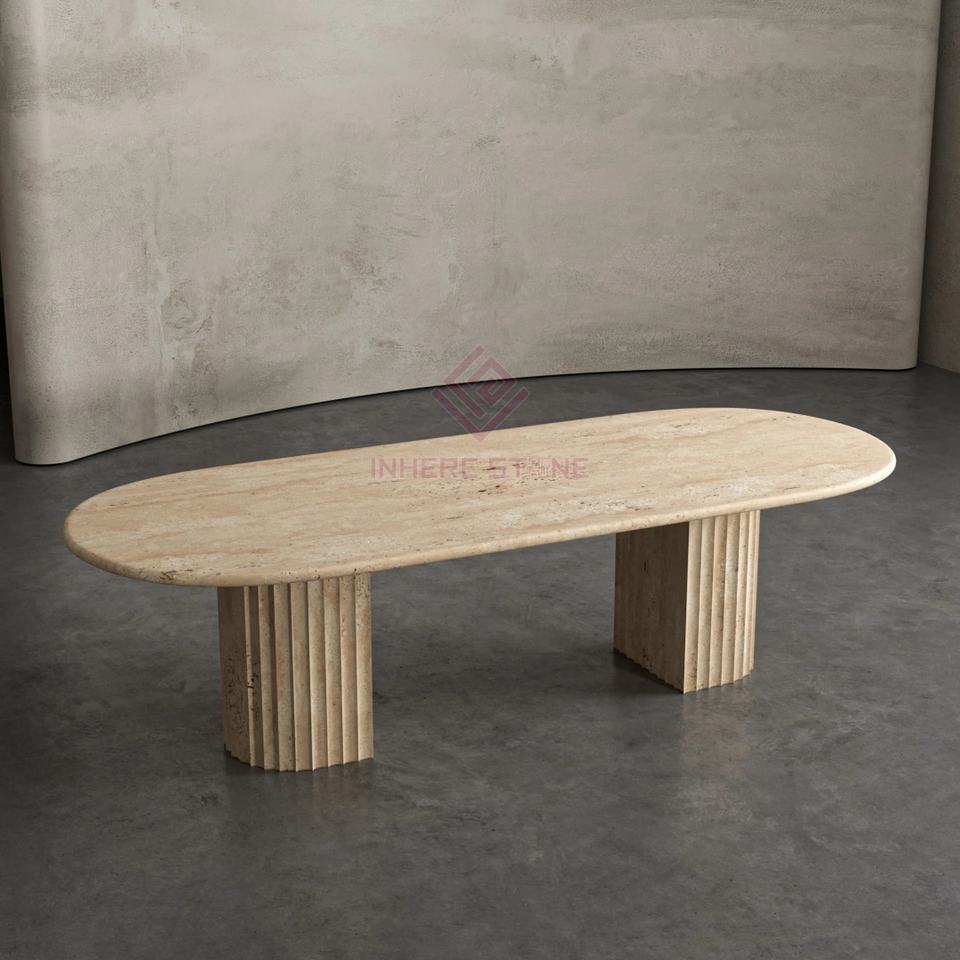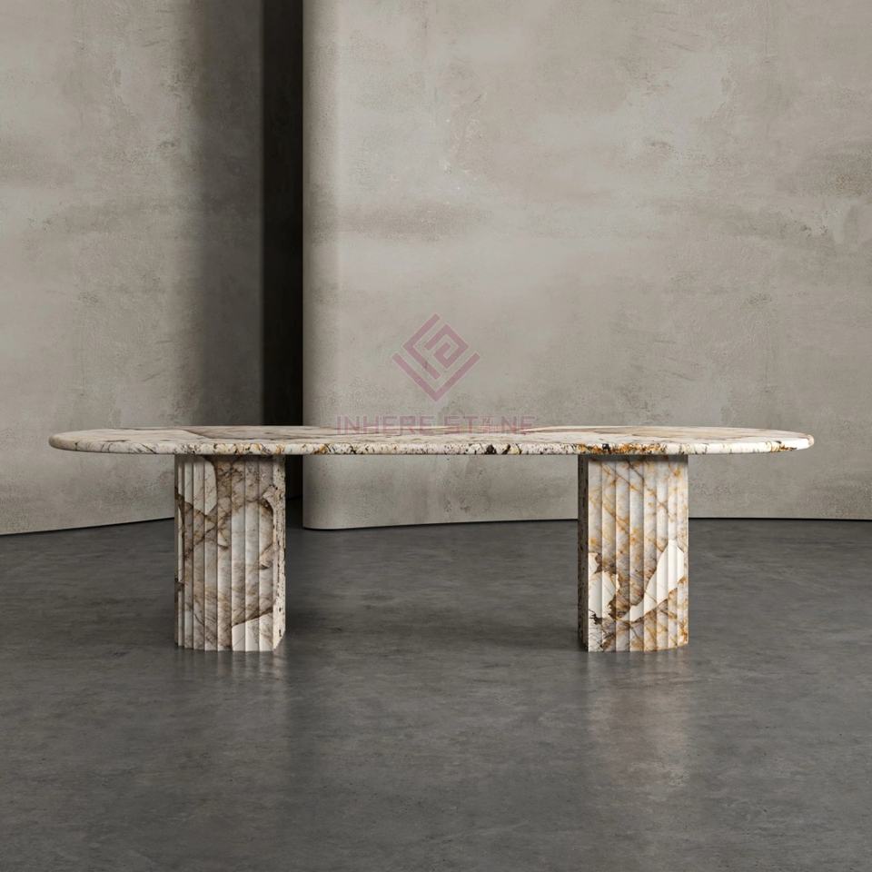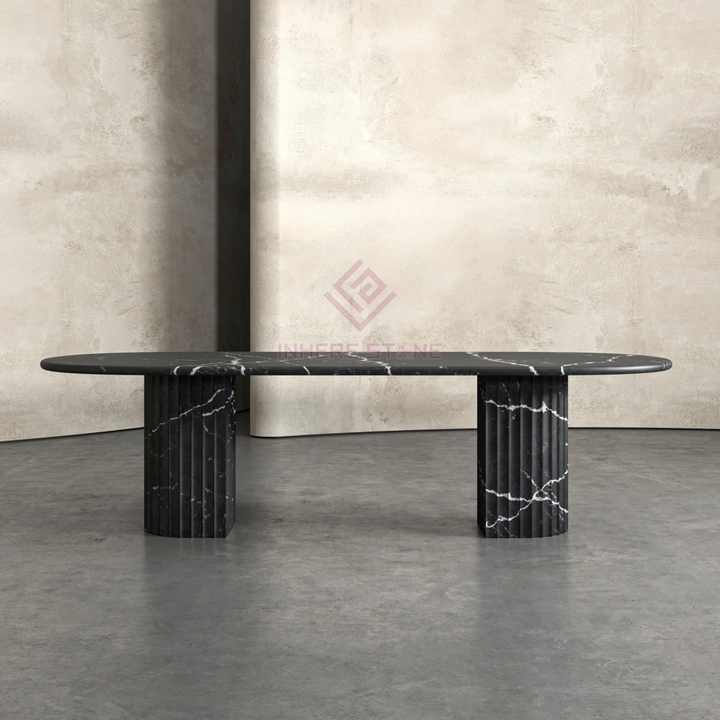 Mesa de comedor de mármol redonda ovalada y estriada de piedra negra Nero Marquina de estilo exótico hecho a mano de calidad exquisita