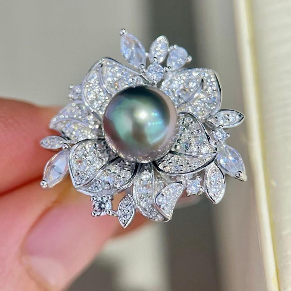 Exquisita Perla Verde Pavo Real de Tahití de 8-9 mm, Incrustación Impecable, Diseño de Flor Ajustable de Lujo, Plata Pura Brillante, Flor de Lujo