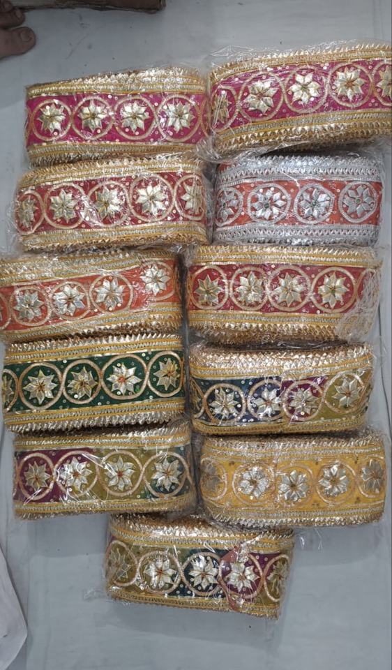 Exquisitos bordes de encaje Gota Patti tradicionales de Rajastán para ropa étnica y manualidades DIY, vibrante juego de cintas con trabajo Gota multicolor.