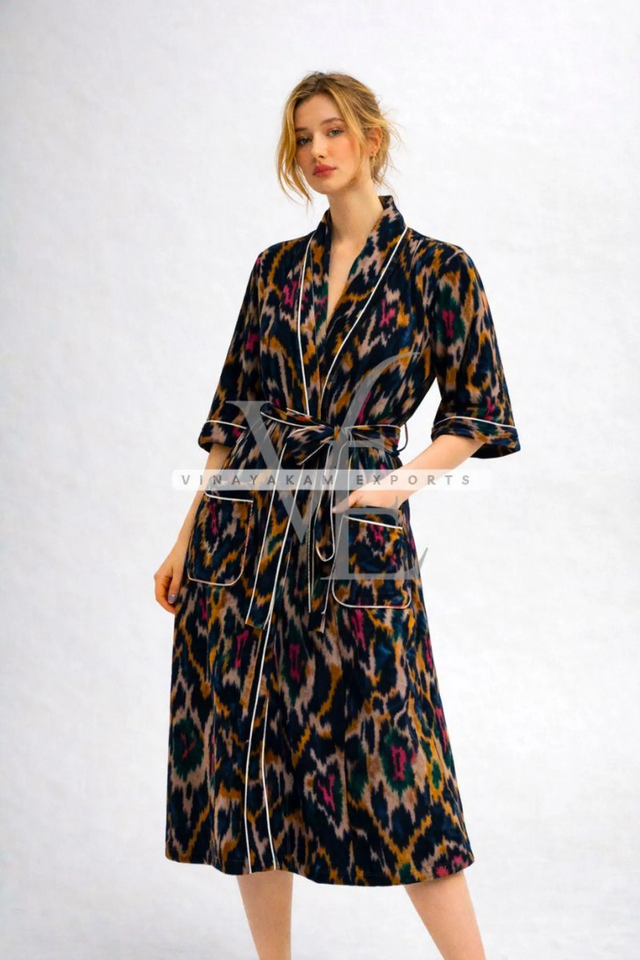 Exquisito Kimono de Terciopelo Ikat, Estilo Casual de Verano, Patrón Ikat Multicolor, Tejido a Mano Intrincado, Manga Larga, Transpirable