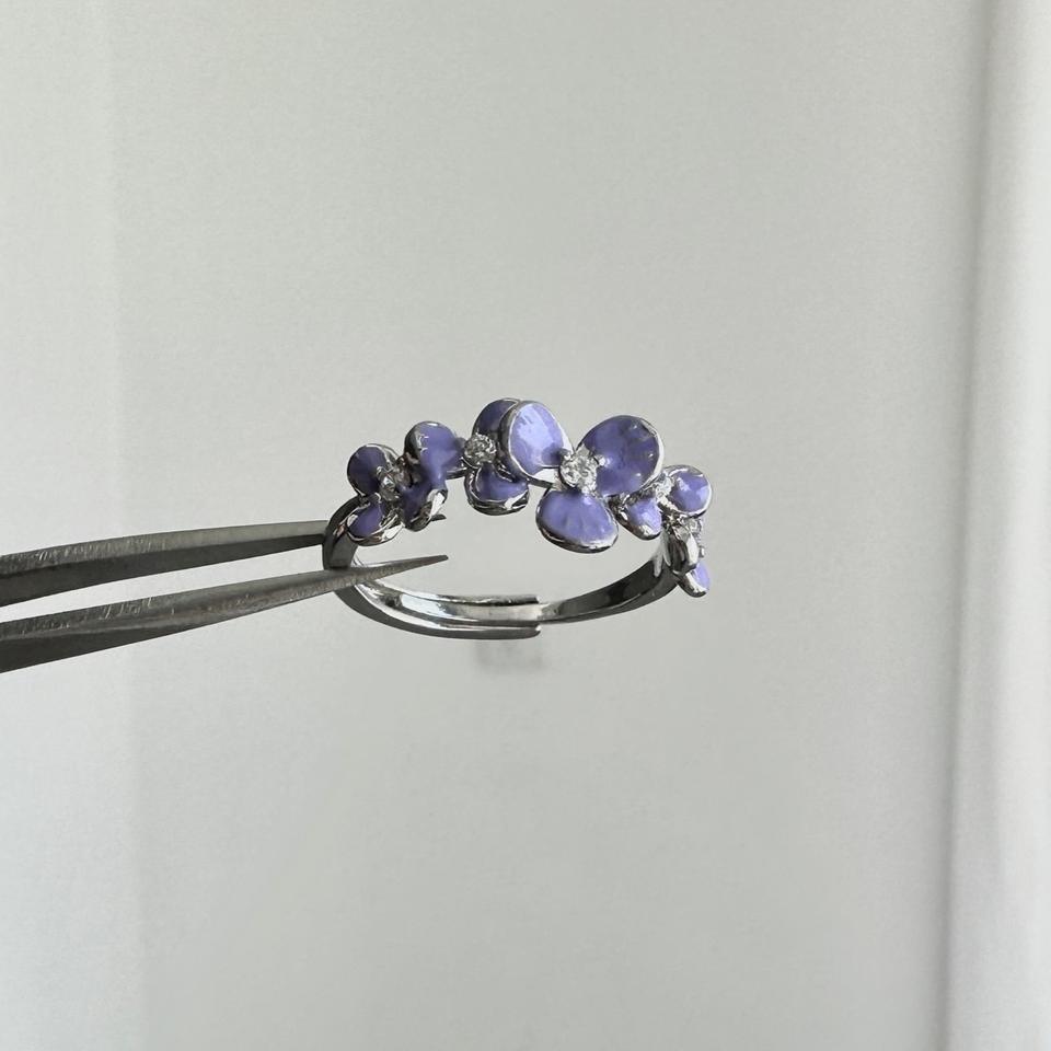 Exquisito Anillo Colgante de Plata de Ley S925 con Flor de Glicinia Morada Vintage Esmaltada para Mujer, Accesorio Dulce y Versátil