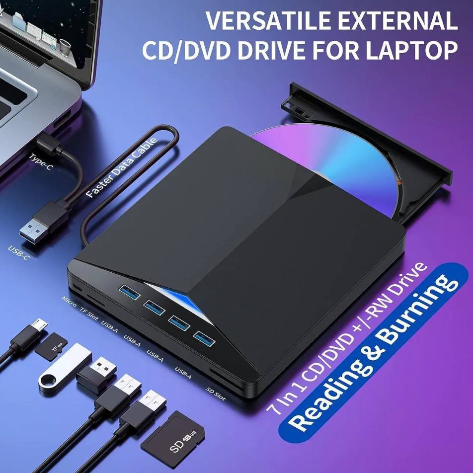 Unidad de CD/DVD Externa 7 en 1 USB 3.0 Tipo C Reproductor y Grabador Portátil para Computadoras Portátiles/PCs Windows/Linux/Mac OS