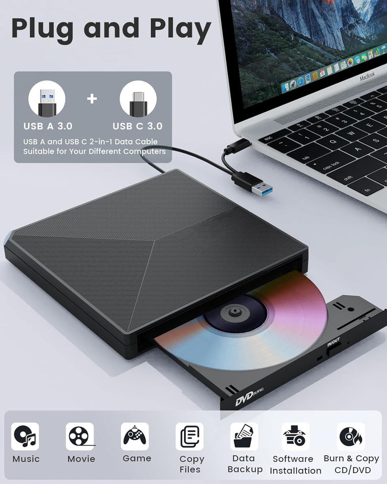 Unidad de DVD Externa Amicool USB 3.0 Tipo-C, Unidad Óptica de CD/DVD +/-RW, Grabadora USB C, Grabadora/Reproductora de CD/DVD ROM Delgada