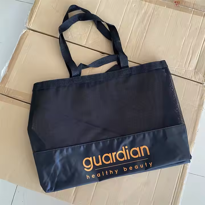 Bolsa de compras de red de malla de nailon con costuras negras con logotipo personalizado extra grande, bolsa de playa para gimnasio, Yoga, Fitness, bolsa de natación de viaje