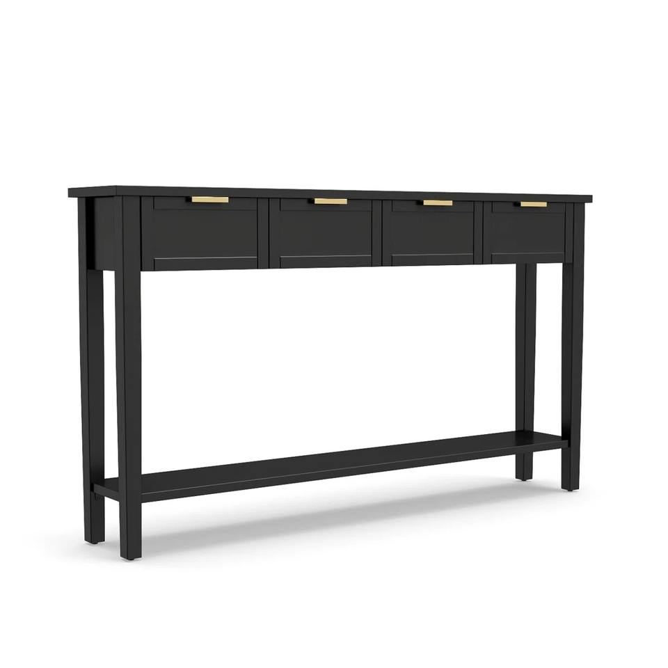Mesa Consola Moderna Extra Larga con Acabado Negro Mate, Tiradores de Latón, Cajones de Almacenamiento, Soporte de Exhibición para Sala de Estar