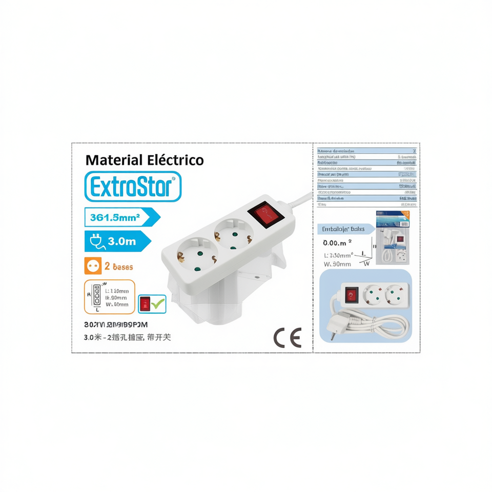 Cable de Extensión de Plástico ExtraStar de 2 Tomas y 3 Metros con Interruptor, Regleta de Enchufes para Sala de Estar, Diseño Moderno y Portátil