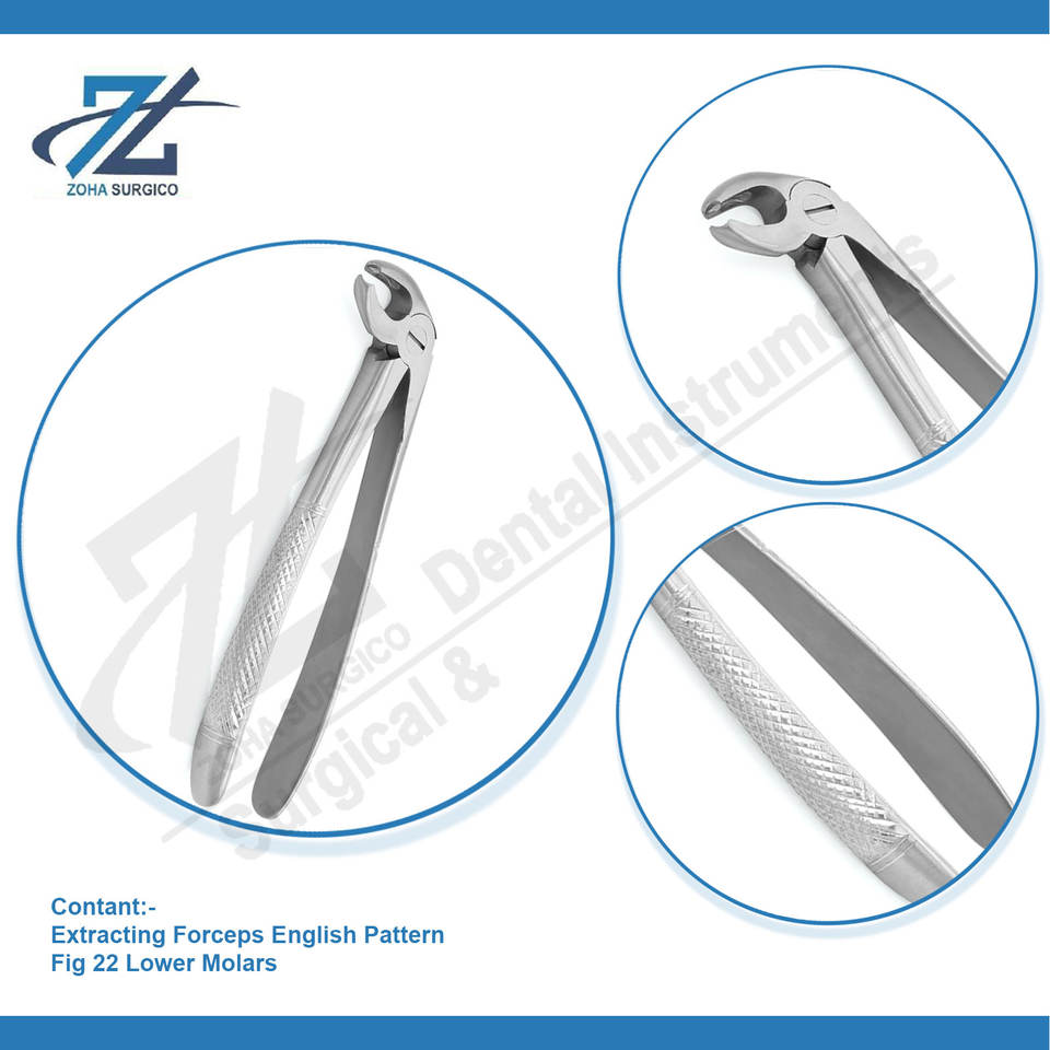 Fórceps de extracción Fig 22 Molares inferiores Fórceps de extracción Premium Patrón inglés Juego dental Instrumentos quirúrgicos Pakistán