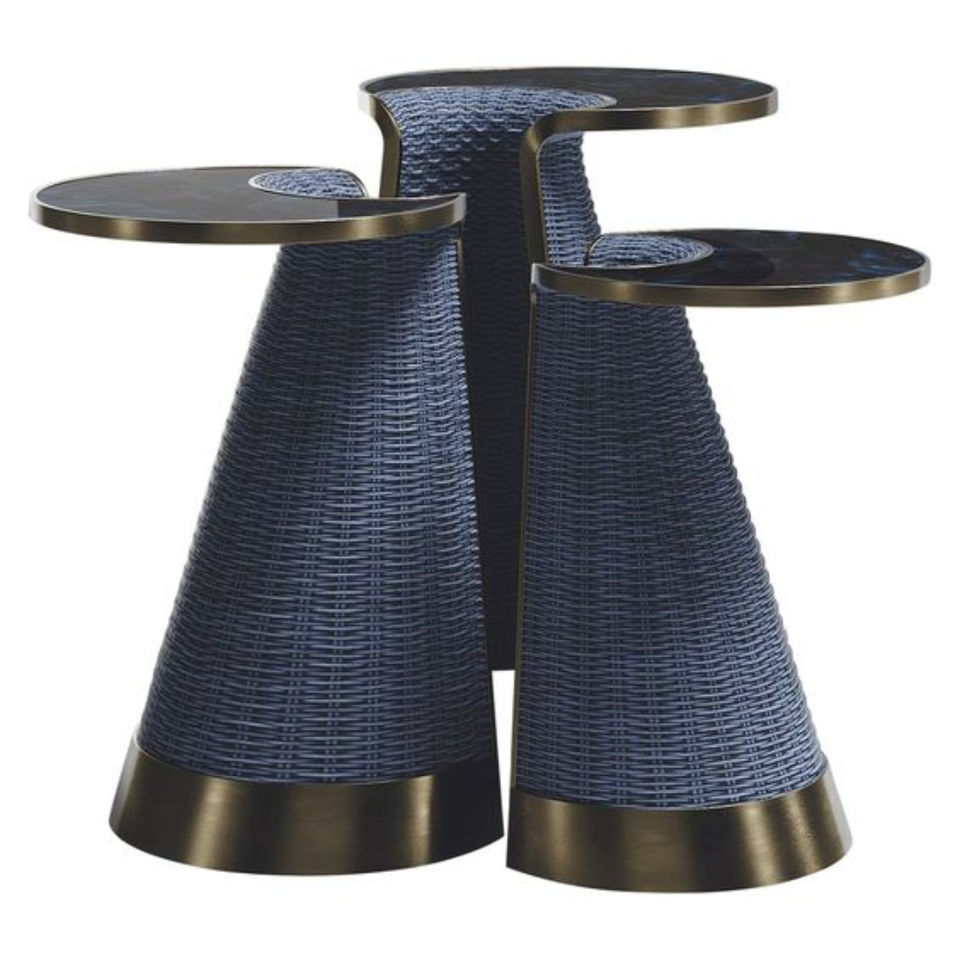 Mesas nido de lujo de color azul llamativo y chapadas en oro, hechas de metal de primera calidad, para decoración de la sala de estar del hogar u hotel.
