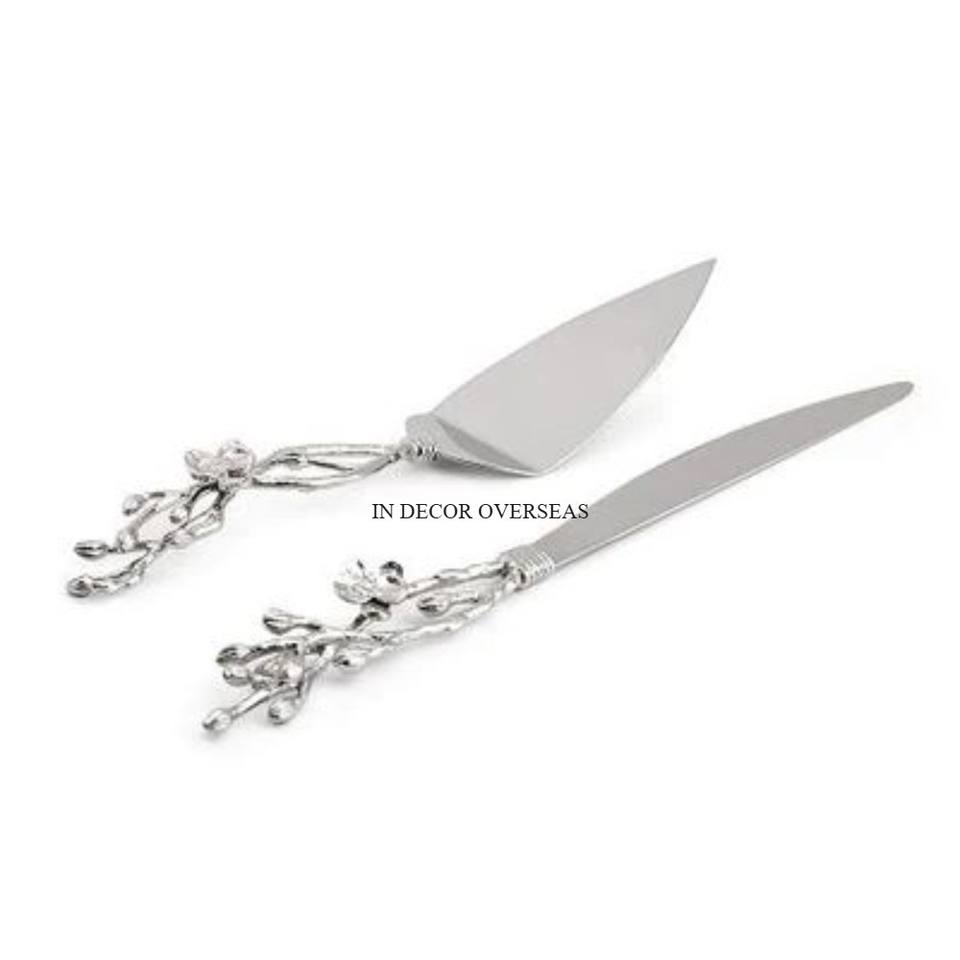 Aspecto llamativo Acabado de color plateado Flores y brotes pulidos brillantes Asas de diseñador para servidor de pasteles y cuchillo de la India