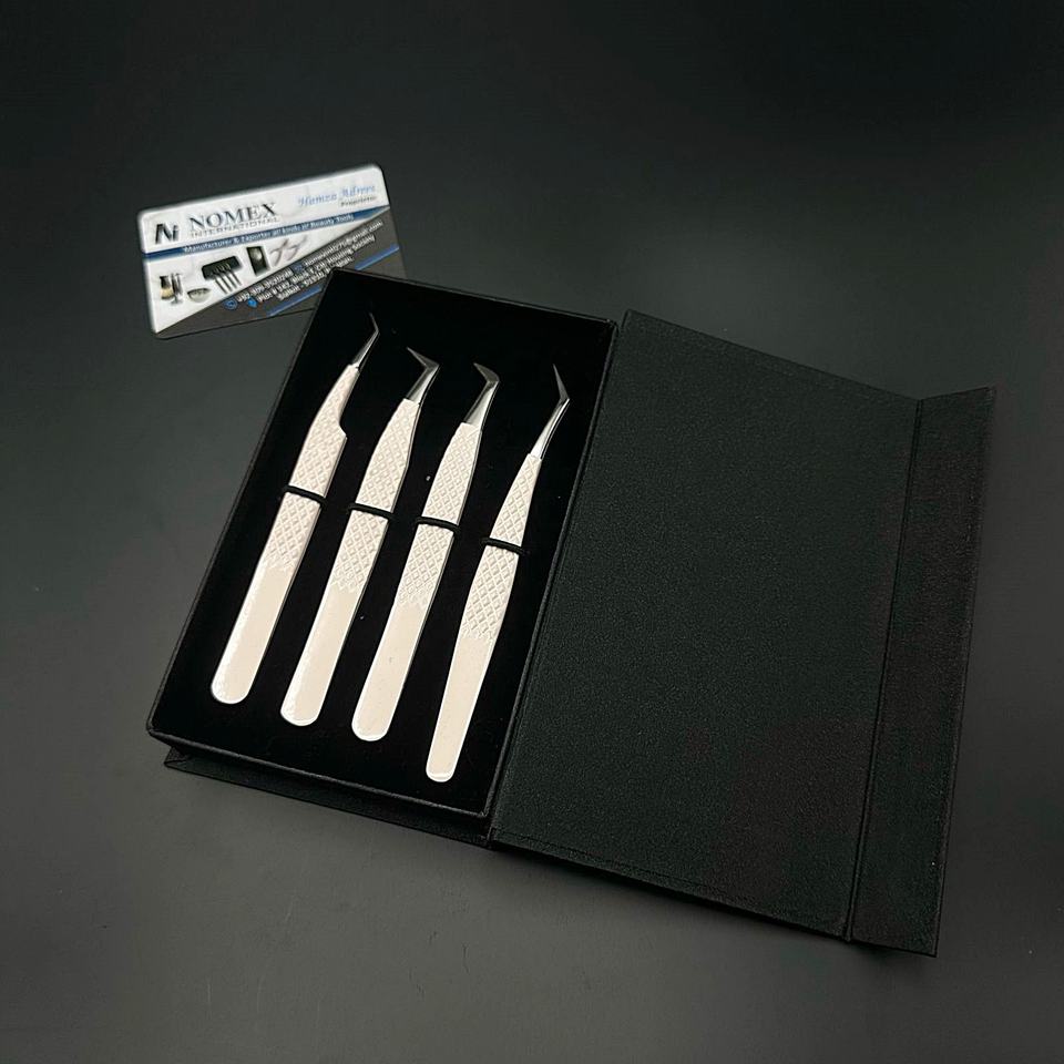 Venta al por mayor extensión de pestañas con logotipo personalizado pinzas de 45 grados de acero sostenible con recubrimiento en polvo con agarre cómodo y Punta puntiaguda