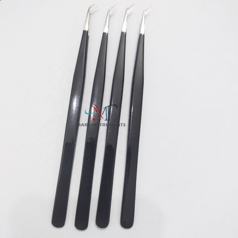 Extensiones de pestañas Pinzas de punta de fibra Acero sostenible Recubierto de polvo negro brillante
