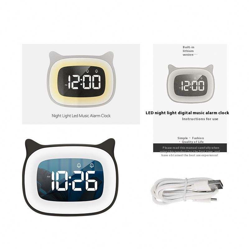 Reloj Despertador LED con Diseño de Gato de Dibujos Animados F-8817, Luz Nocturna Musical, Electrónico Silencioso para Escritorio de Estudiantes, Dormitorio Infantil, Oficina en Casa, Sala de Estar, Regalo