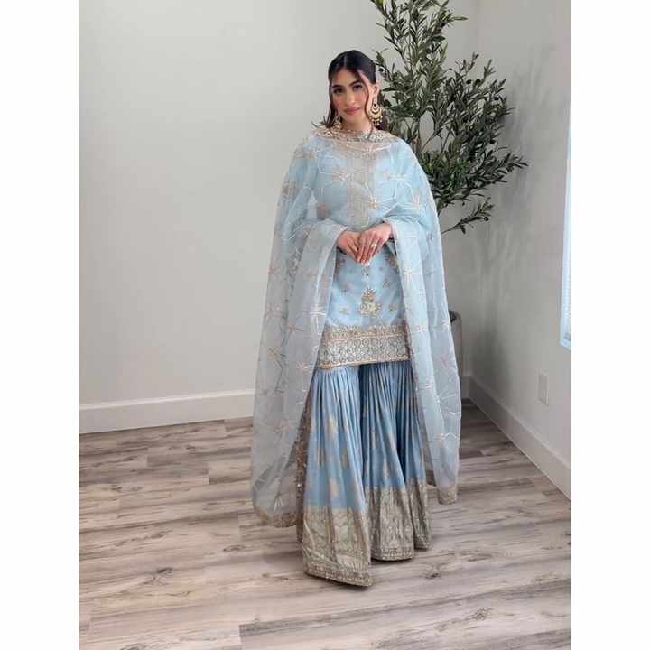 FANCY GEORGETTE BORDADO SECUENCIA TRABAJO TOP SHARARA CON DUPATTA SKY