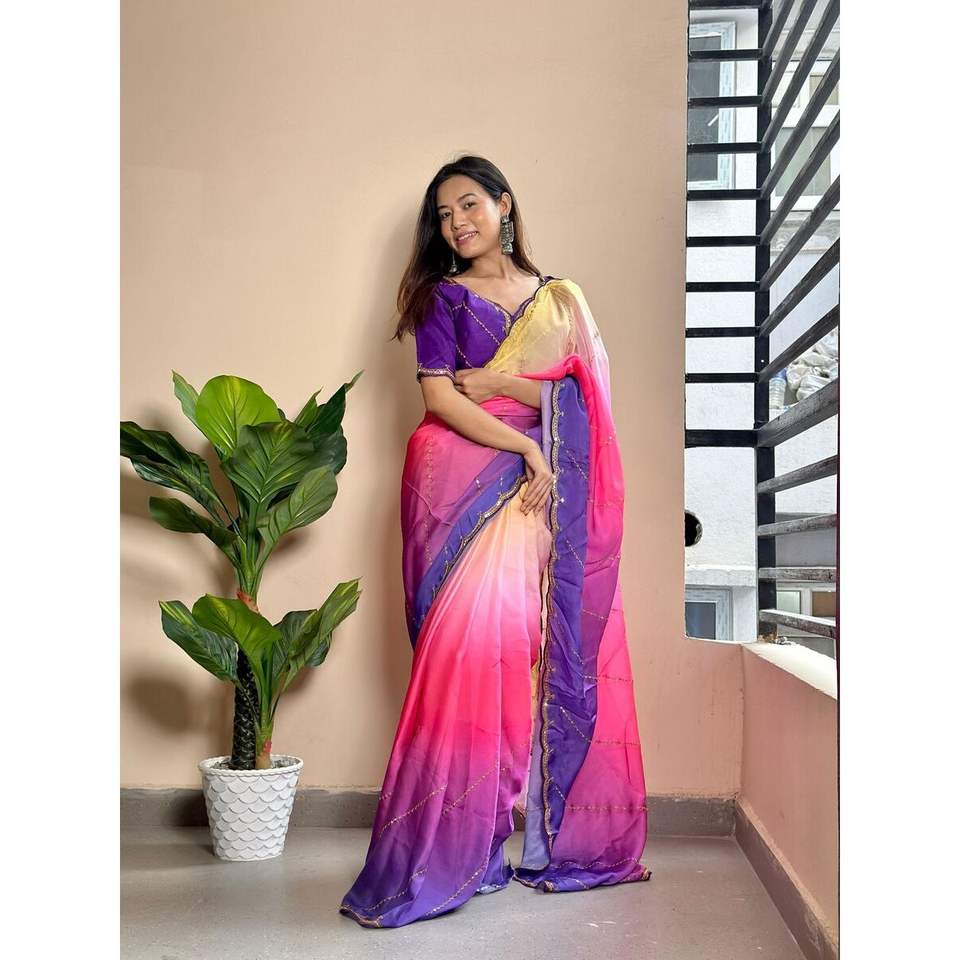 FANCY GEORGETTE SATIN DIGITAL PRITN BORDADO SECUENCIA TRABAJO SAREE CON BLUSA COSTADA ROSA