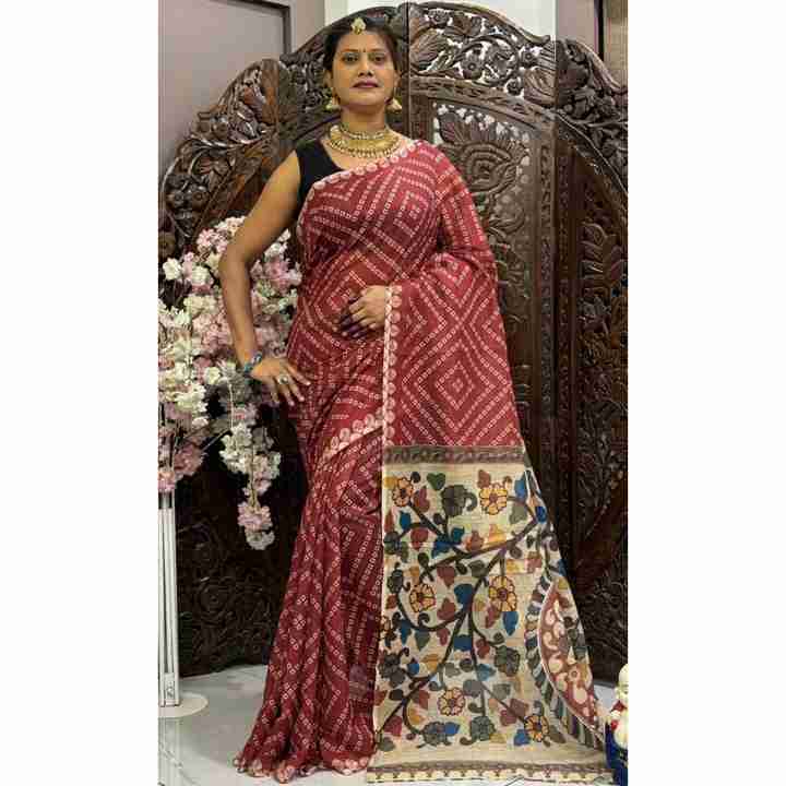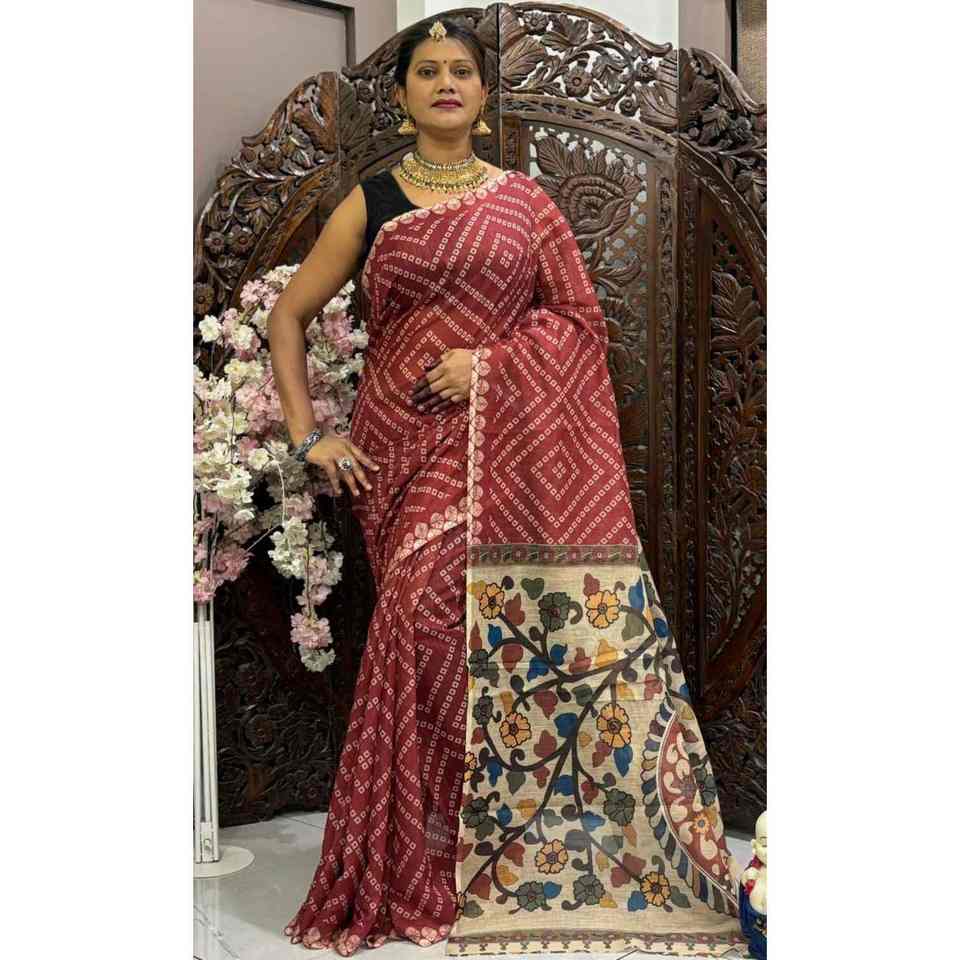 FANCY LINEN BANDHEJ TRABAJO DE IMPRESIÓN DIGITAL SAREE CON BOLUSE DESECHADO MAROON