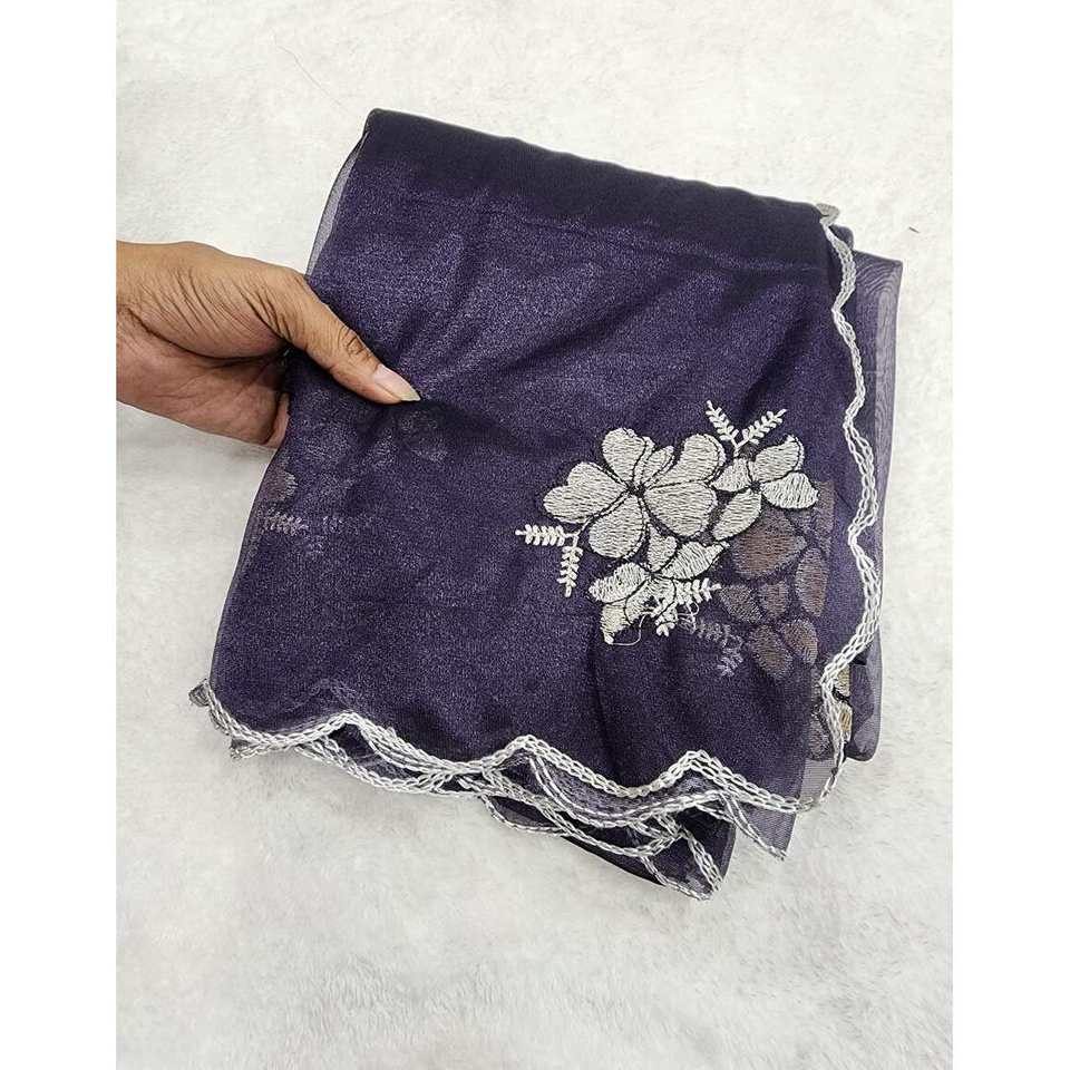 FANCY SARGA SEDA BORDADA TRABAJO SAREE CON BLUSA DESCOSTADA AZUL