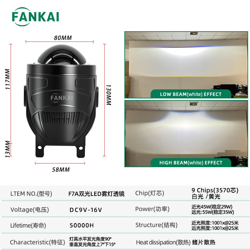 FANKAI Lente de Luz Antiniebla LED Bi-Xenón F7A de 3.0 Pulgadas y Alta Potencia 55W, Luz Blanca, Aluminio, Luz Alta/Baja Integrada, Montaje Universal