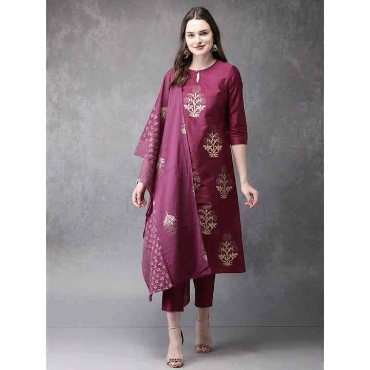 Conjunto de Top y Pantalón de Algodón con Estampado Metálico y Dupatta Color Granate