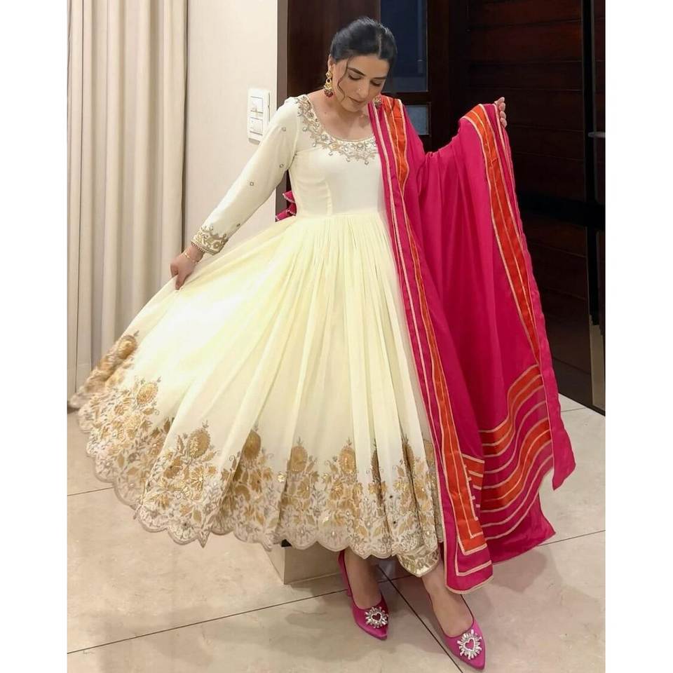 VESTIDO DE TRABAJO BORDADO DE SECUENCIA DE GEORGETTE A LA MODA CON DUPATTA DE BLANCO
