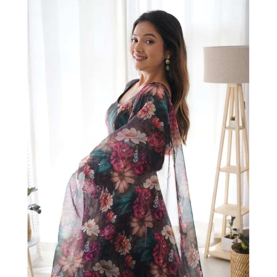 PANTALÓN DE BATA DE TRABAJO CON IMPRESIÓN DIGITAL DE ORGANZA SUAVE A LA MODA CON DUPATTA MULTI COLOR