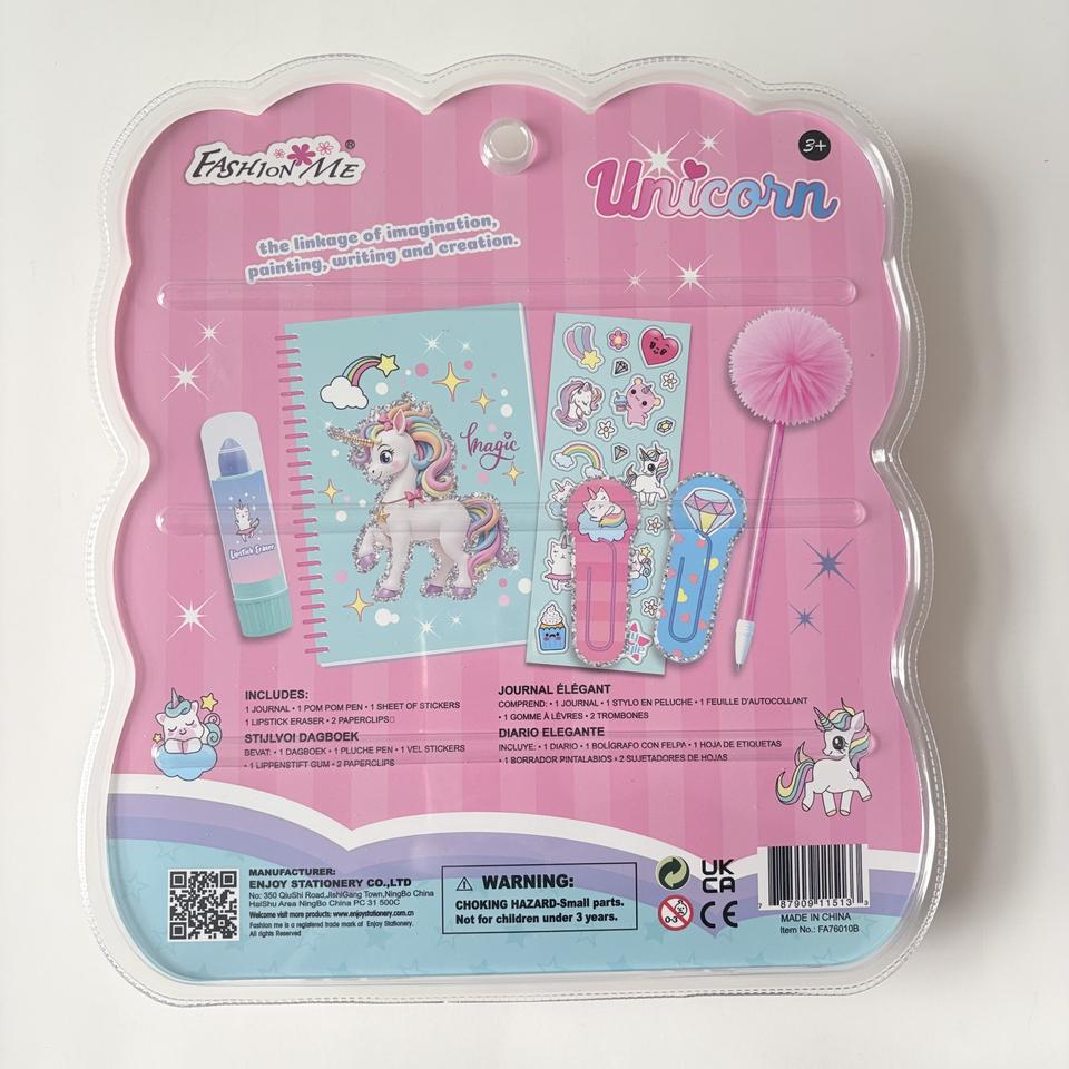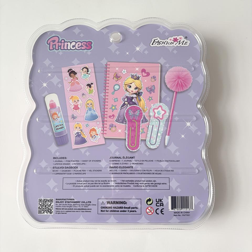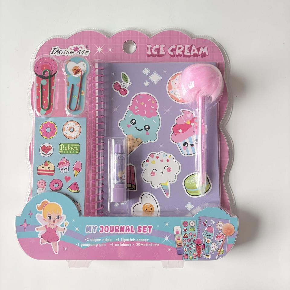 Set de Diario FASHIONME con Bolígrafo de Pompón y Borrador con Forma de Lápiz Labial, Estilos Surtidos, Incluye Cuaderno, 2 Clips y 20 Pegatinas
