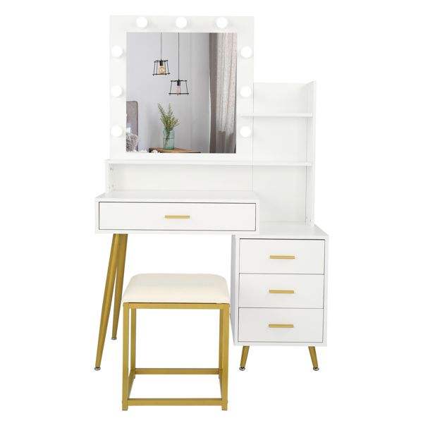 FCH - Juego de tocador grande con 9 luces LED, taburete acolchado, 3 estantes de almacenamiento, 4 cajones y mesa de maquillaje