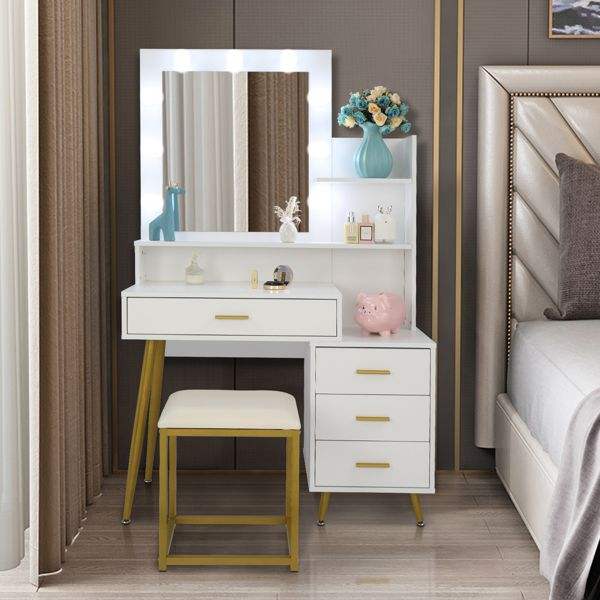 FCH - Juego de tocador grande con 9 luces LED, taburete acolchado, 3 estantes de almacenamiento, 4 cajones y mesa de maquillaje