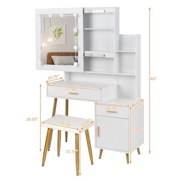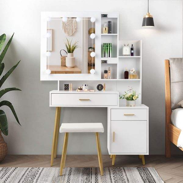 FCH Juego de tocador blanco con 2 cajones, 1 puerta, 2 estantes, espejo, 3 bombillas, chapa de triamina, tocadores de maquillaje