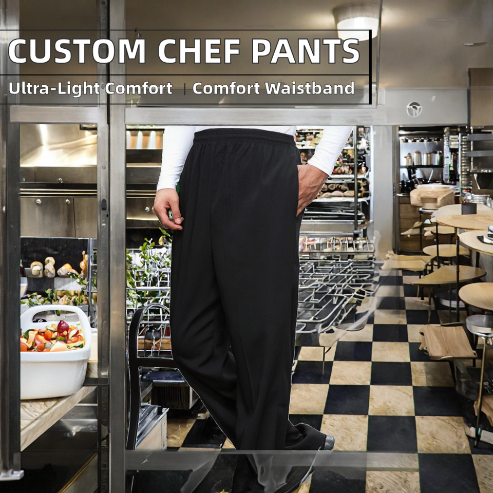 Pantalones de Chef Unisex de Manga Larga con Logotipo Personalizado FESHO WEAR, Tejido de Poliéster/Algodón, Ligeros, Holgados, Clásicos para Restaurante y Cocina