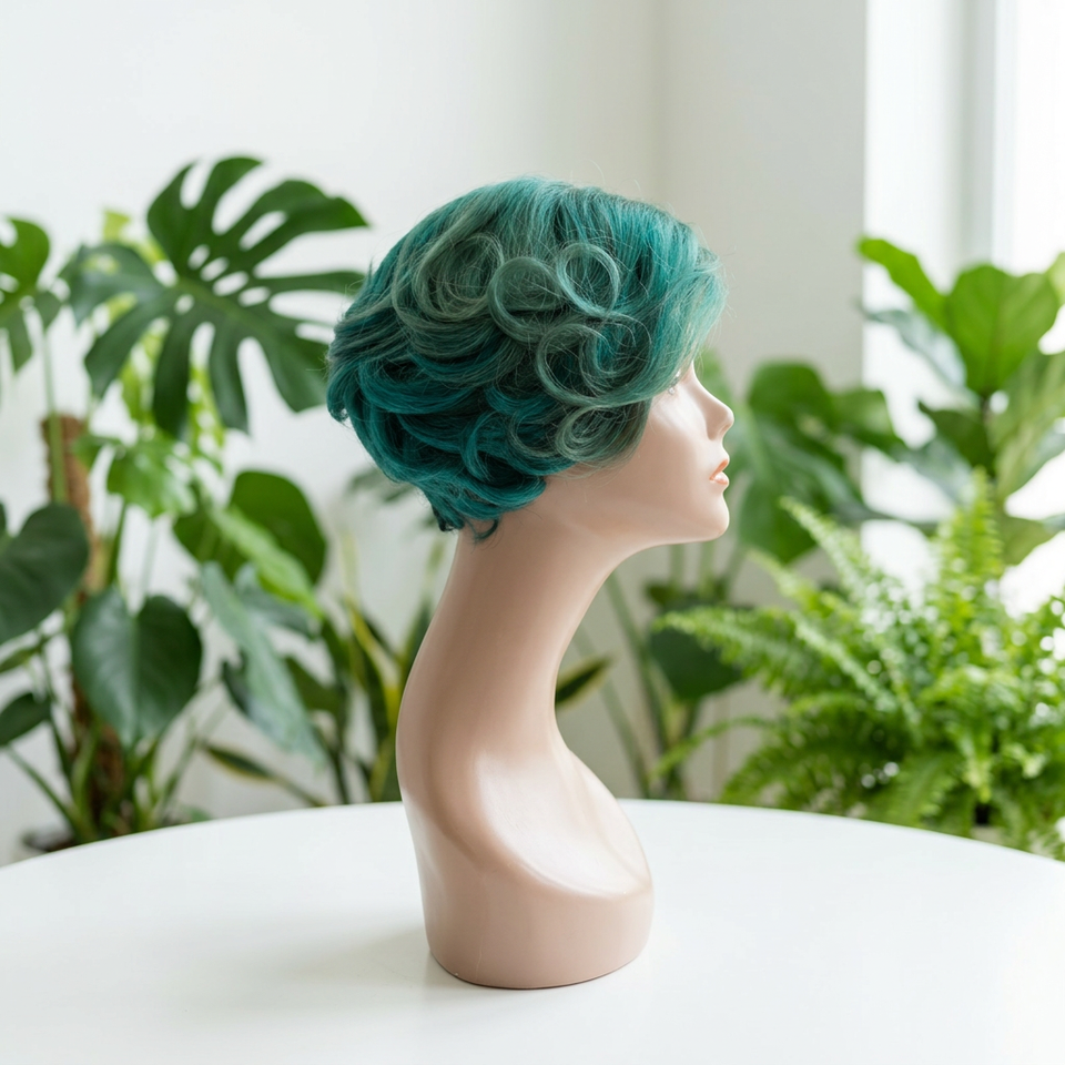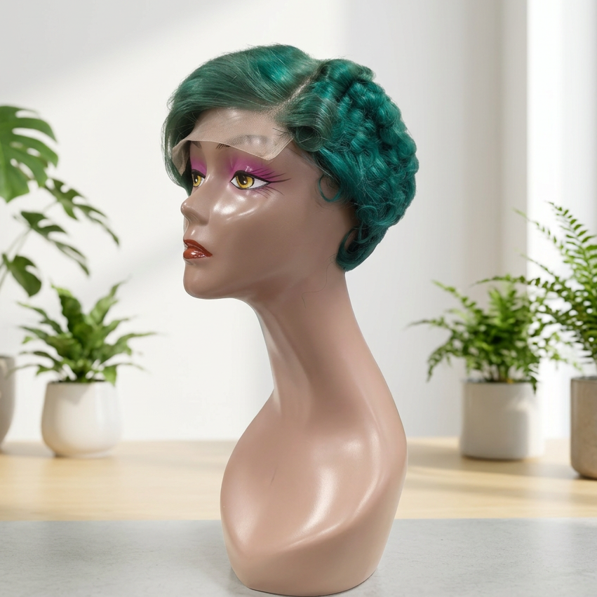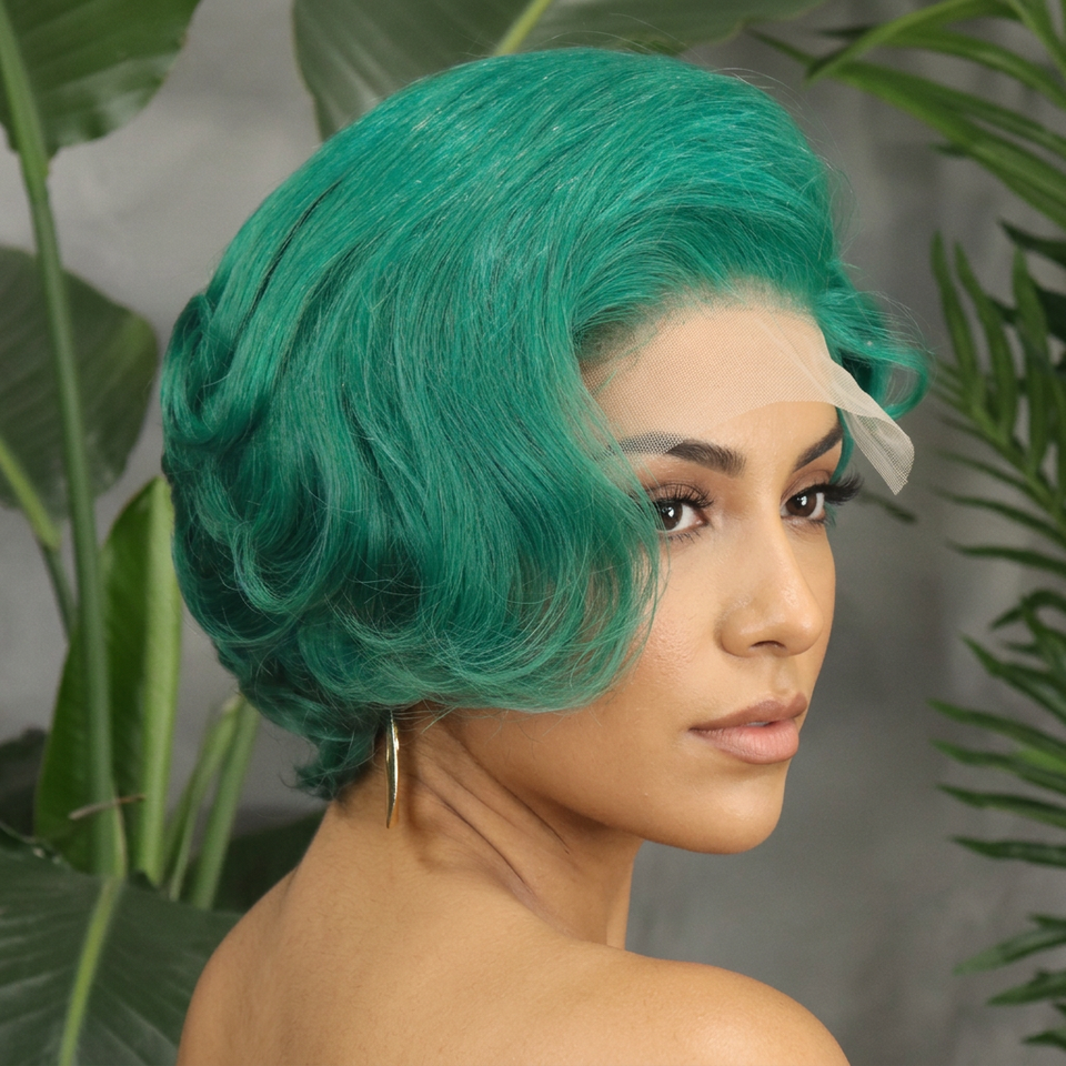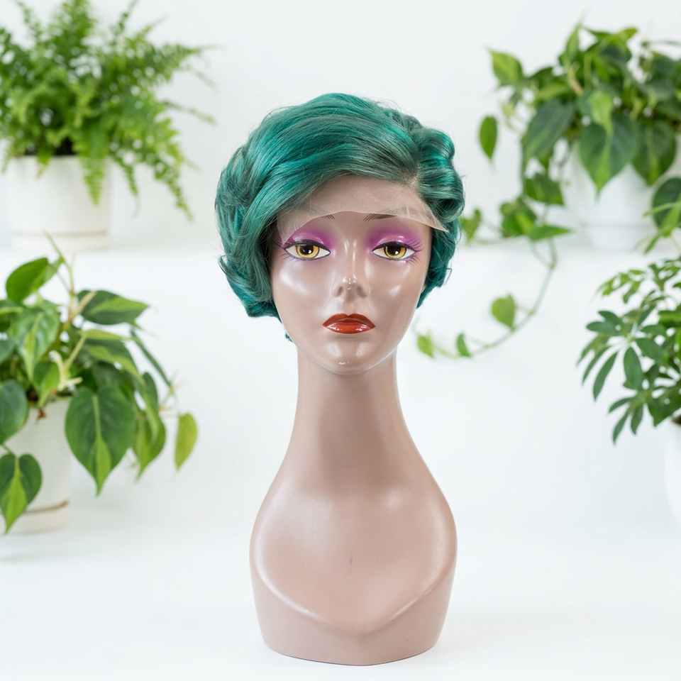 Peluca FH 5x5 con Cierre, Corte Pixie, Parte Lateral, Sin Pegamento, Encaje Frontal, Verde, 100% Cabello Humano, Peluca Corta Pixie