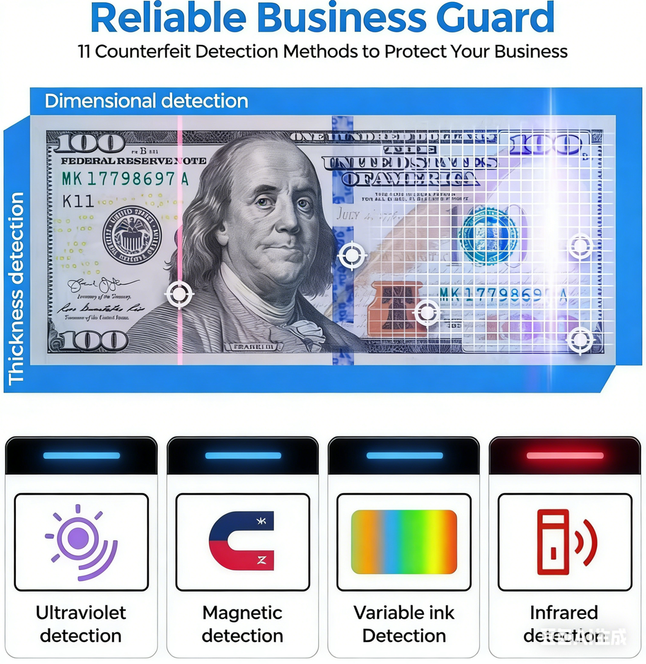 Máquina detectora de dinero en línea con detección Uv, identificación en línea de múltiples monedas, efectivo falso