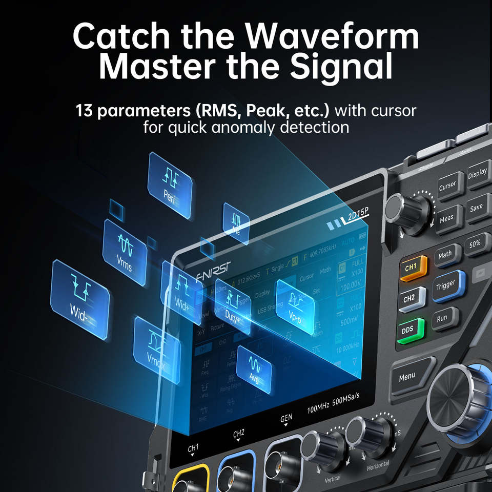 Osciloscopio Digital con Pantalla Táctil FNIRSI 2D15P, Multímetro, Generador de Señales 3 en 1, Doble Canal, 100MHz, 500MSa/s, 20000 Contenedores