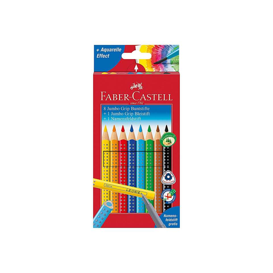 Faber Castell Farbstifte Jumbo Grip 8er Kartonetui + 1 Jumbo Bleistift + 1 Namensfeldstift
