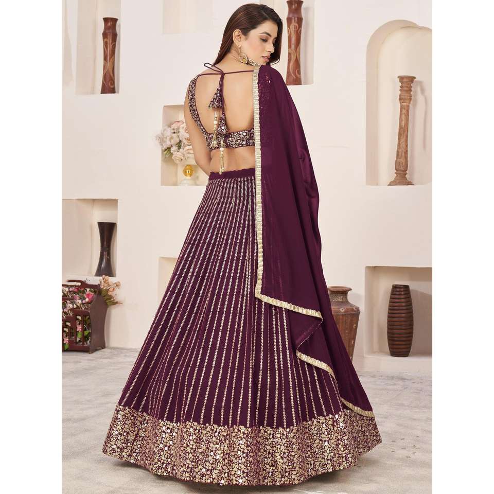 Fabuloso Georgette Recepción Wear Lehenga Choli con vino Lentejuelas Vestidos de noche