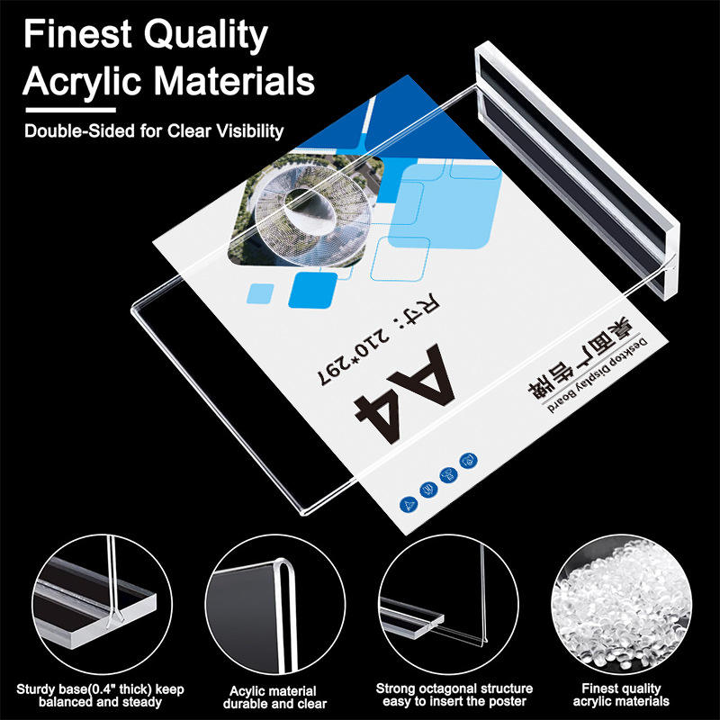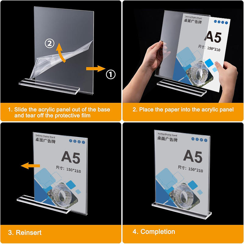 Expositor de mesa de acrílico A4 de fábrica, tarjetero extraíble A6, letrero de mesa, etiqueta de precio publicitaria, soporte de exhibición de alta gama tipo T A5