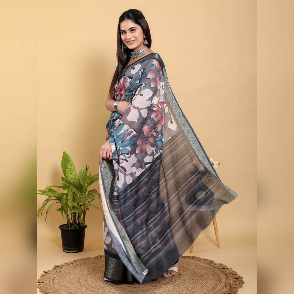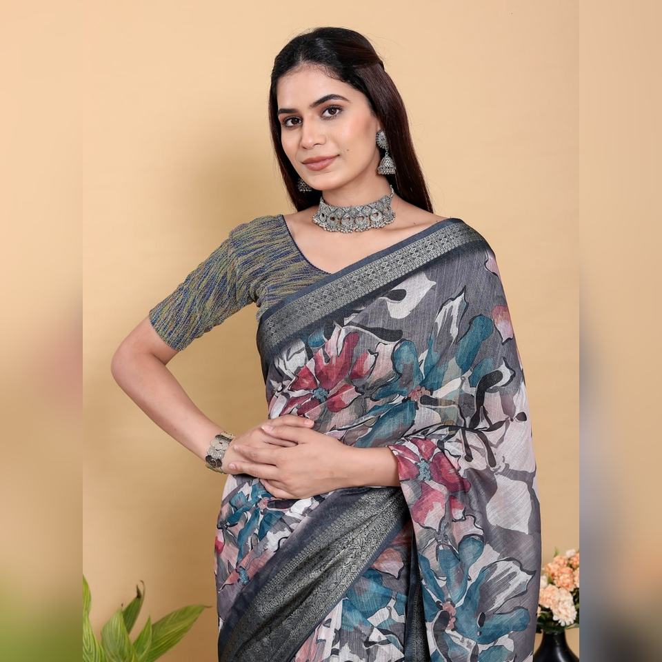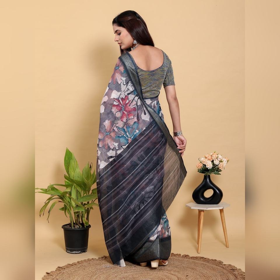 Sari de Lino y Algodón con Estampado Floral Abstracto en Gris y Negro, Modelo GG-617, Transpirable, Color Gris Carbón