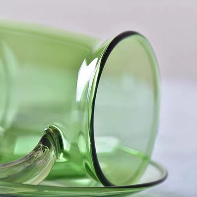 Precio barato de fábrica Nuevo diseño Juego de tazas de vidrio Taza de café de vidrio coloreado con platillo