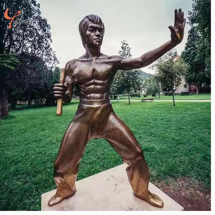 Estatua de Bruce Lee personalizada de fábrica, escultura artesanal de Metal de bronce antiguo, famoso modelo de Bruce Lee, cobre chapado grabado