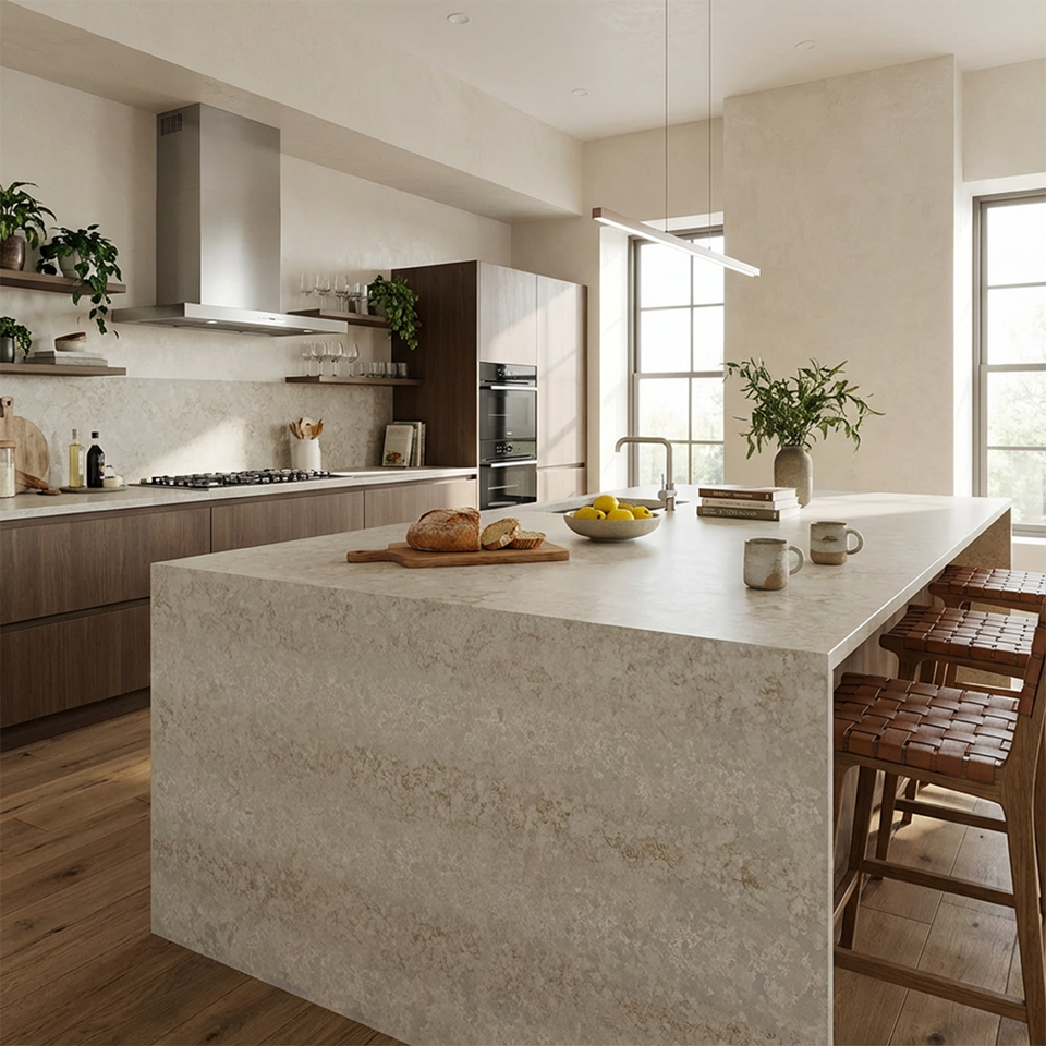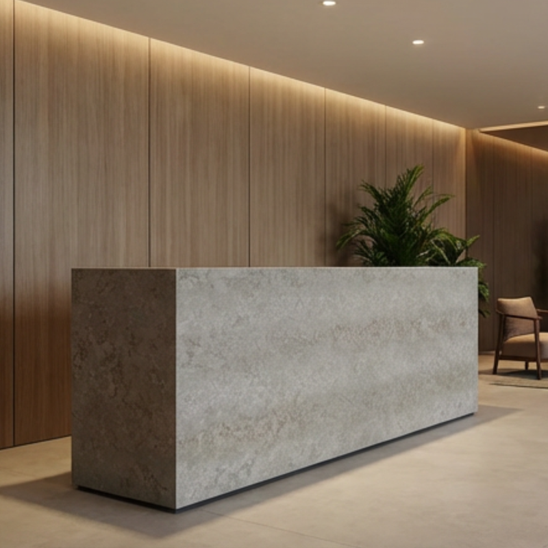 Encimera de Cuarzo Sintético con Diseño de Cuero Gris con Vetas Doradas, Personalizada de Fábrica, para Isla de Cocina, Tocador de Baño, Recepción de Hotel