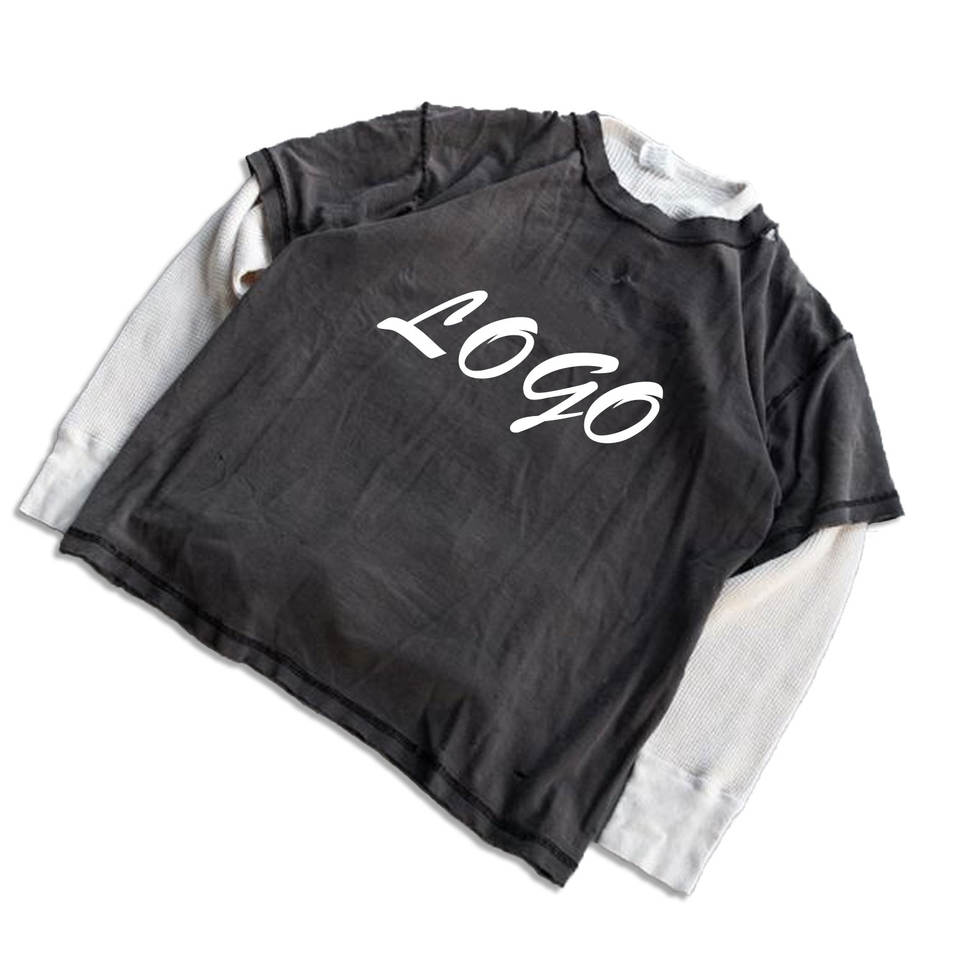 Camiseta de manga larga de doble capa con estampado de logotipo personalizado de fábrica, camisetas de algodón lavado con ácido para hombre, Hip Hop