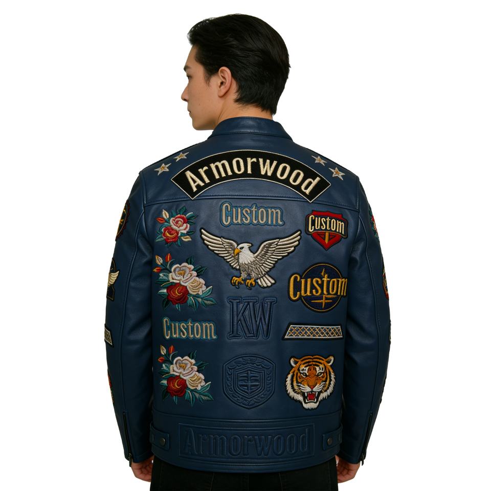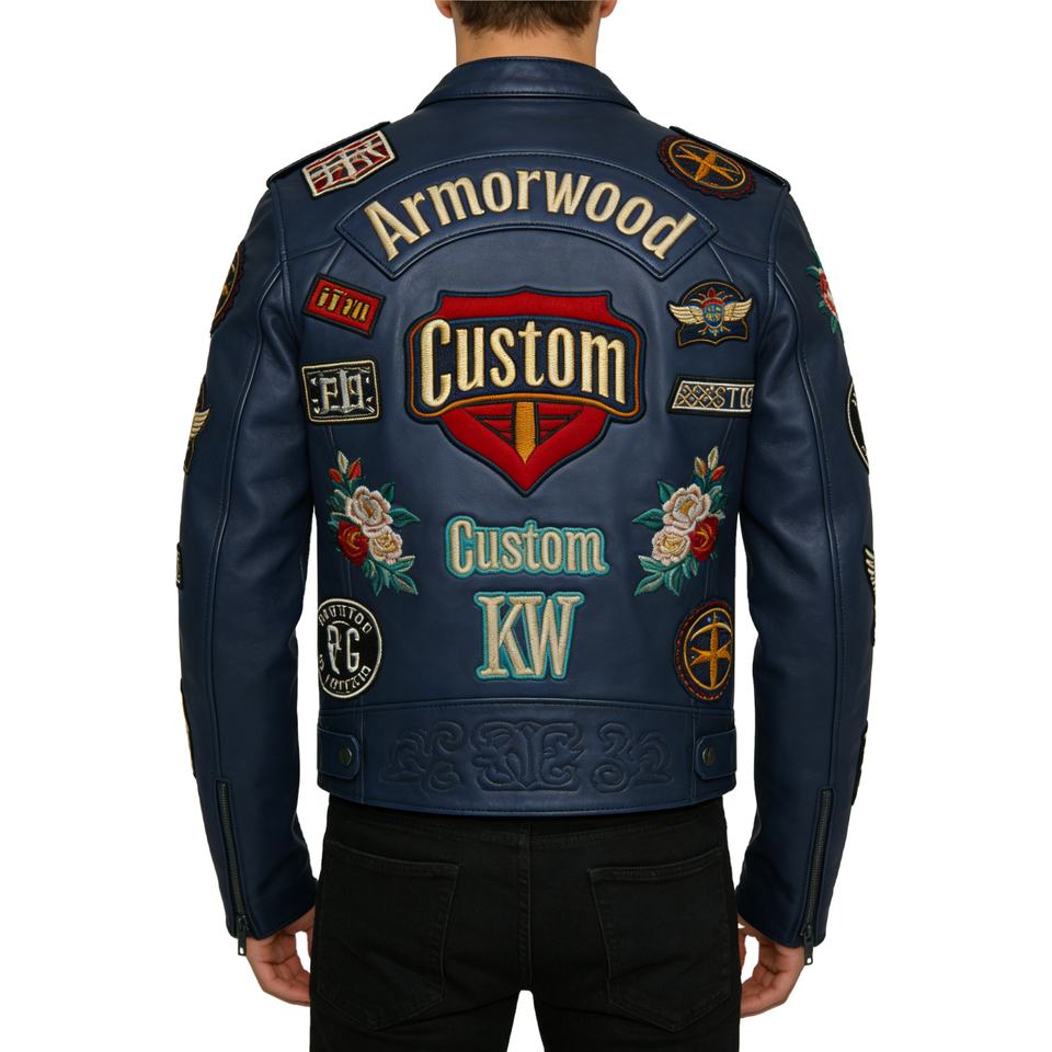 Chaqueta de Motociclista de Cuero Vacuno Bordada Personalizada de Fábrica para Hombre, Chaqueta de Carreras de Cuero Azul Marino OEM