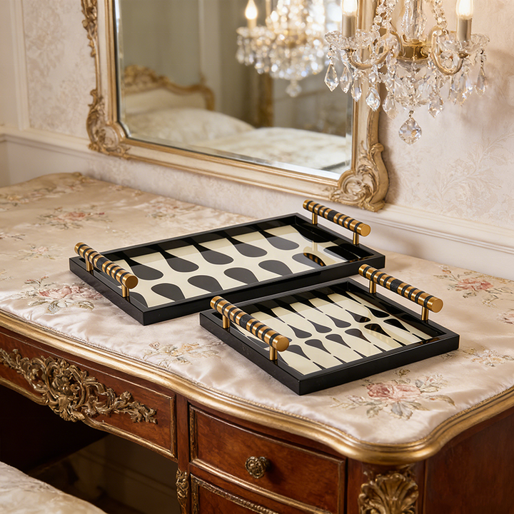 Juego de bandejas de madera geométricas modernas personalizadas de fábrica, bandeja decorativa con patrón negro y crema con asas de latón